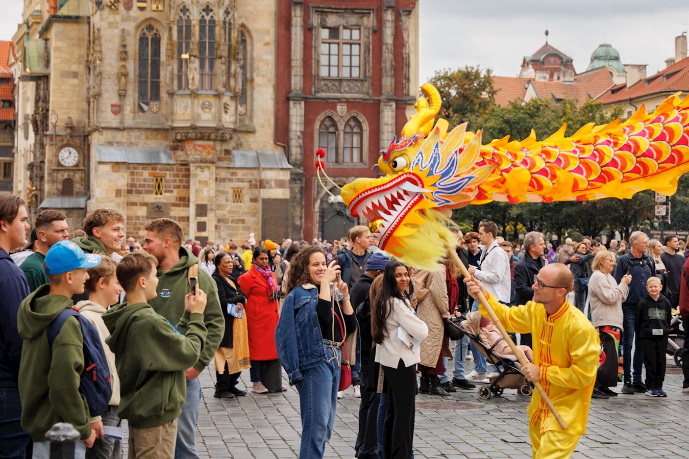 انطلقت المسيرة على الساعة ١١ صباحًا من ساحة هرادشانسكي واختتمت في ساحة المدينة القديمة. اصطفّ السياح والسكان المحليّون في الشوارع، مستمتعين بالموسيقى النابضة بالحياة والموكب المزركش بالألوان. إلى جانب فرقة تيان غوو الموسيقيّة، تضمّن الموكب تنينين صينيين ملونّين، وأسدين، ورقصة الجنّية مع زهور لوتس أوريغامي، وفرقة طبول الخصر. سجّل العديد من الناس الحدث على هواتفهم وتلقّوا منشورات عن المدرسة.