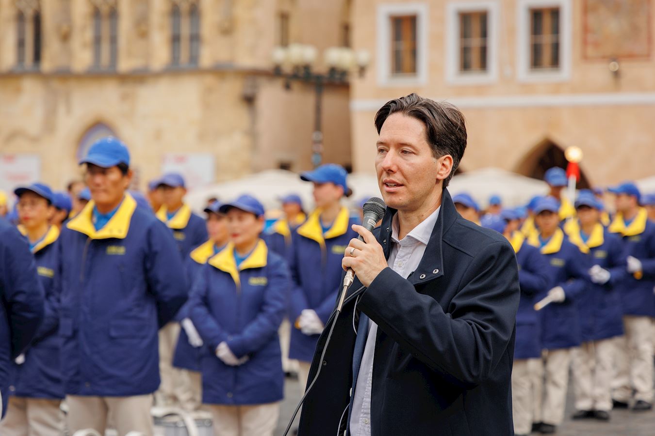 ألقى ليوس سترناد، المتحدّث باسم جمعيّة الفالون دافا التشيكيّة، كلمة في ساحة المدينة القديمة.
