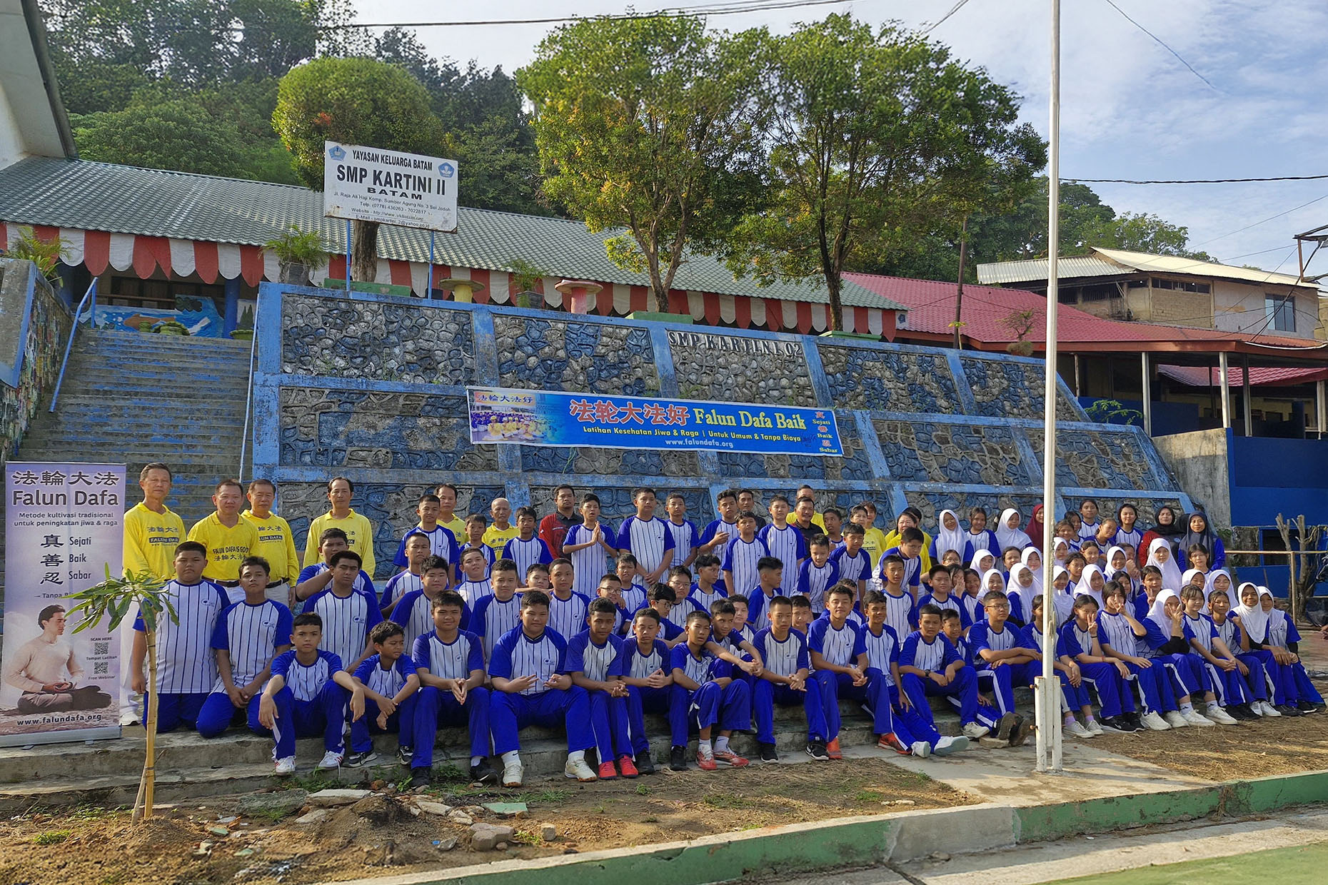 (Minghui.org) قدّم ممارسو الفالون دافا الممارسة الروحية وتمارينها لمدرّسي وطلّاب مدرسة كارتيني ٢ الإعدادية في مدينة باتام يوم الخميس ٧ أغسطس ٢٠٢٥. وخاطب المدير الطلاب والموظّفين وأشاد بالفالون دافا، قائلاً إنّ ممارستها وسيلة فعّالة لتحسين الطبيعة الأخلاقيّة لدى الطلاب وصحّتهم.