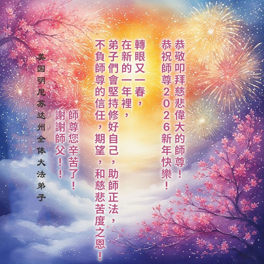 نتقدّم بأحرّ التهاني إلى المعلّم بمناسبة حلول العام الجديد! لقد وصلت عائلتنا إلى هنا مؤخّرًا. في المكان الجديد، سنواصل القيام بـالأشياء الثلاثة على أكمل وجه: دراسة الفا وممارسة التمارين، وإرسال الأفكار المستقيمة، وتوضيح الحقيقة للعموم - وخاصّة توضيح الحقيقة لأعضاء الكونجرس والشيوخ في هذه المنطقة بشأن الاضطهاد، ودعم زملائنا الممارسين في الصين، ووقف الاضطهاد.