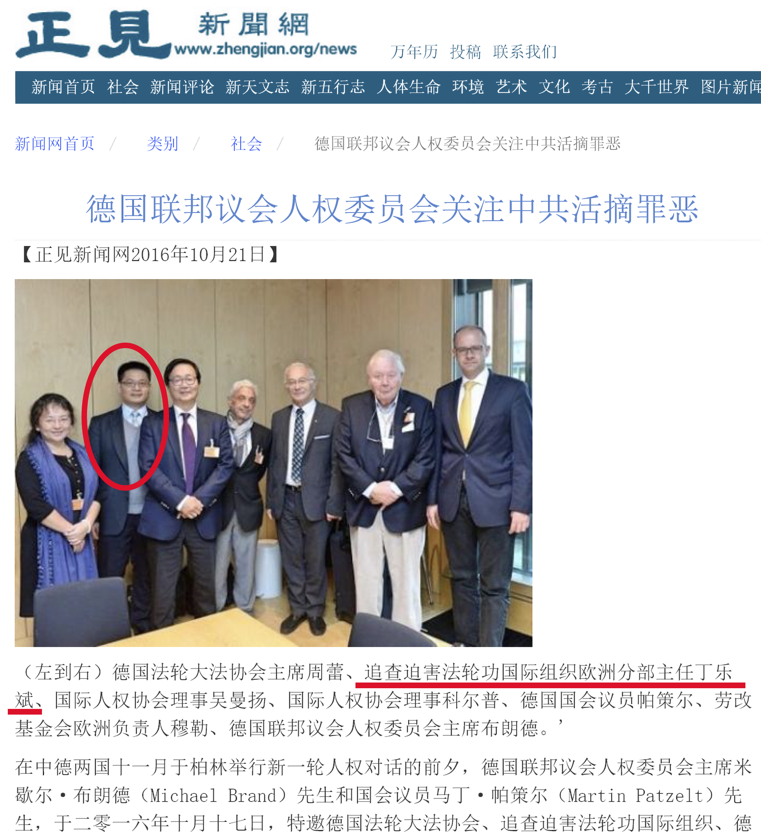 فعلى سبيل المثال، بعد وصوله إلى ألمانيا، قال دينغ إنّ أفرادًا من عائلته قد اعتُقلوا في الصين بسبب ممارستهم الفالون دافا، وذكر أنّه بحاجة إلى المساعدة وطلب السكن لدى ممارس غربي. بدافع اللطف والتعاطف، استضافه أحد الممارسين واصطحبه لزيارة عشراتٍ من أعضاء البرلمانات.