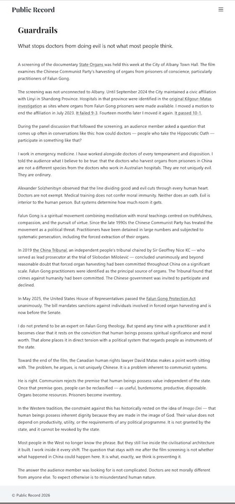 (Minghui.org) عُرض الفيلم الوثائقي State Organs، الذي يتناول قمع الحزب الشيوعي الصيني للفالون غونغ، في مدينة ألباني بأستراليا الغربيّة في ١٥ مارس ٢٠٢٦. استضاف أحد أعضاء مجلس المدينة الفعاليّة في قاعة المدينة، وكتب لاحقًا مقالًا لكشف قسوة الحزب الشيوعي الصيني.